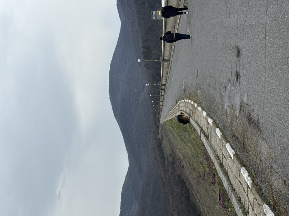 The image displays an exterior view of a dam structure, located in the vicinity of Баня, Bulgaria, under an overcast sky. The upper portion of the frame is dominated by a uniform light grey sky. The background consists of rolling hills densely covered with bare deciduous trees, indicating a winter or early spring season. A paved asphalt road, showing minor surface imperfections and small potholes, extends from the foreground towards the distant background, curving rightward along the dam's crest. To the left of the road, a grassy embankment slopes downwards, bordered by a concrete curb painted with alternating white and dark segments. Patches of small purple flowers are visible on this embankment in the foreground. To the right of the road, a concrete barrier supports a series of regularly spaced lampposts, each topped with a spherical white light fixture. Three entities are present. Two individuals are observed walking away from the camera on the asphalt road. The lead individual, positioned to the left, wears a dark jacket and dark trousers. The second individual, to the right, wears a dark jacket with a high-visibility band on the collar and uses a single walking pole in their right hand. Further left, on the grassy embankment adjacent to the curb, a medium-sized dog with tan and dark fur markings is positioned with its head lowered, appearing to sniff the ground. No direct interaction between the dog and the pedestrians is evident.