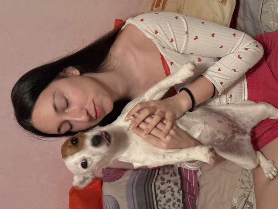 The scene depicts one female and one dog in an indoor setting, identified as Galabovtsi, Bulgaria. The female, with long dark hair, is positioned on the right, her eyes closed. She wears a white, ribbed, long-sleeved top with small red heart patterns and red lace trim, paired with red shorts. Light-colored manicured nails are visible on her hands, and a black elastic hair tie is on her right wrist. She holds a small, predominantly white dog, possibly a Jack Russell Terrier, which has brown patches on its head and right ear. The dog's pink tongue is slightly extended from its mouth. Its front paws rest on the female's clasped hands, and its face is oriented towards her left cheek. In the background, a light pink wall is visible, along with parts of a bed, including a patterned duvet or blanket and several pillows, one of which is orange. The lighting suggests an interior artificial light source.