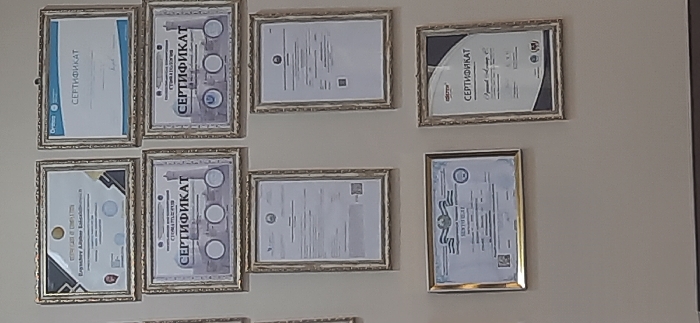 The scene depicts the interior of a professional establishment, likely a dental clinic, located in Kogon City, Uzbekistan. Nine framed documents, predominantly certificates, are displayed vertically on a light-colored, plain wall. Each document is encased in an ornate, gold-colored rectangular frame with decorative borders. Several certificates feature the Cyrillic word "СЕРТИФИКАТ" (Certificate). Two prominent certificates in the second row from the top include an illustration resembling a building or structure with four circular elements, and the Cyrillic word "СТОМАТОЛОГИЯ" (Stomatology/Dentistry), confirming a dental context. The top-left certificate shows a small photographic portrait of an individual and partially visible English text "CERTIFICATE OF COMPLETION" alongside the name "Ergashev Akmal Eshkabulu...". Other documents display various logos, seals, and QR codes. No individuals are present, and no actions or interactions are depicted. The lighting is uniform, illuminating the displayed documents against the neutral wall surface.