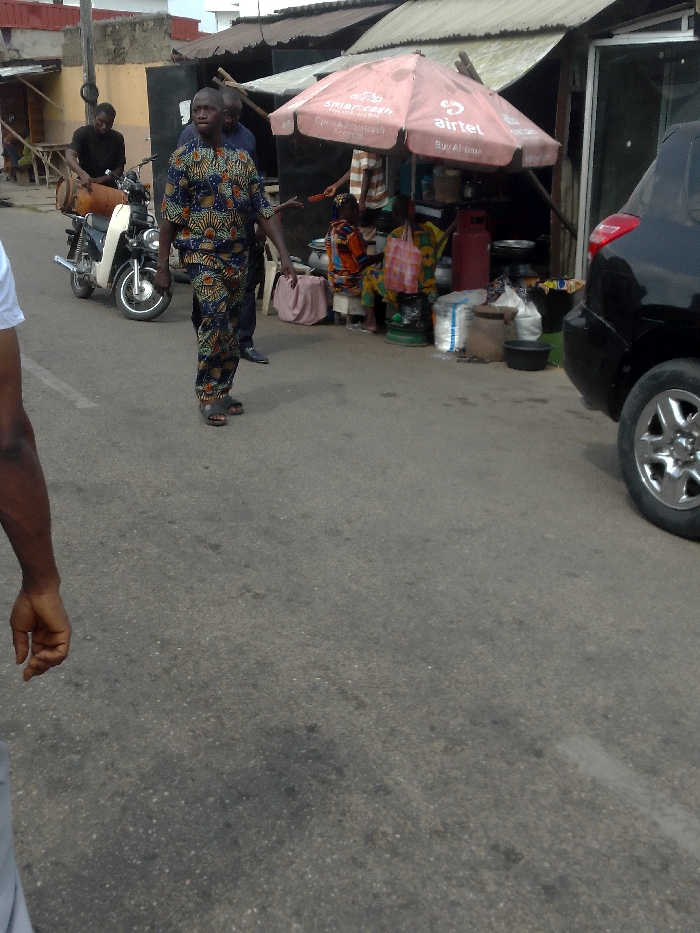 A street scene in the City of Unknown, Unknown, shows an asphalt road with various individuals and commercial activity. In the immediate foreground on the left, a partial view of a dark-skinned arm and shoulder, wearing a light-colored shirt, is visible. Centrally, a dark-skinned male, approximately 40-50 years old, walks towards the right, wearing a patterned dark blue and orange traditional two-piece outfit and dark sandals. His left hand is slightly raised. Directly behind him, another dark-skinned male in a dark blue shirt is partially obscured. On the far left, a dark-skinned male in a black shirt stands next to a white motor scooter with chrome accents, on which a large brown drum is secured. The scooter is parked on the side of the road. To the right, an open-air market stall operates under a large, red octagonal umbrella branded "Airtel," advertising "SmartCash" and "Buy Airtime." Beneath the umbrella, at least two dark-skinned individuals, possibly women, are seated on low stools, clad in colorful patterned clothing. Around them are various items, including metallic bowls, plastic buckets, sacks (one white with blue printing), a red gas cylinder, a large brown pot, and a pink shopping bag. Adjacent to this stall, the rear quarter panel and a silver spoked wheel of a black SUV are visible, parked parallel to the road. The background features simple, single-story buildings with corrugated metal roofs, indicating commercial or residential structures. The lighting suggests daylight conditions, possibly overcast.