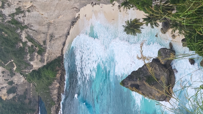 An aerial perspective captures a tropical coastline. Azure waters crash into a sandy beach bordered by rugged cliffs on the left. Palm trees dot the shoreline and perch atop rocks near the water's edge. Lush vegetation and grasses frame the right side of the view, adding a sense of depth and proximity to the foreground. The image showcases the natural beauty of a remote coastal location.