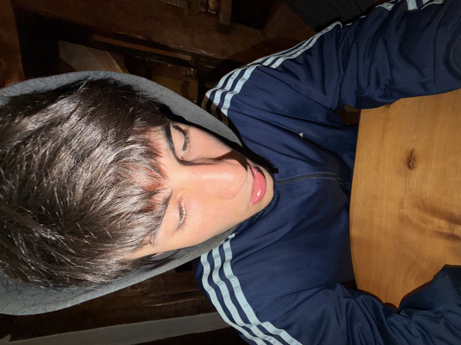 A person wearing a dark blue jacket with white stripes sleeps on a wooden surface. Their eyes are closed, and their lips are slightly parted. The person's head is partially covered by a grey hoodie. The background is dark and blurry. The lighting emphasizes the person's face and the texture of the wooden surface.