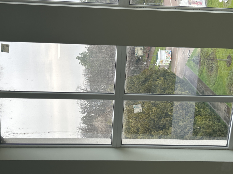 The image displays an outdoor scene in Silistra, Bulgaria, viewed through a multi-paned window with white frames. The window glass is visibly dirty, exhibiting streaks, smudges, and particulate matter, with two rectangular white labels affixed to its surface (one upper right, one lower left). The external environment, observed under an overcast sky, features a dense line of trees on the horizon, comprising a mixture of bare deciduous trees and green conifers. Below this treeline, a landscaped area is visible. In the mid-ground, a dark green, dense evergreen hedge runs diagonally, bordering a paved path. A central paved area contains a small, white, rectangular kiosk-like structure decorated with colorful fruit illustrations. Further back in the paved area, faint outlines of what appears to be a basketball hoop and benches are discernible. The lower right section of the view includes a patch of green grass featuring a single, small, leafless tree with a circular, mulched base. No individuals are present in the visible scene, and no specific actions or interactions are depicted.