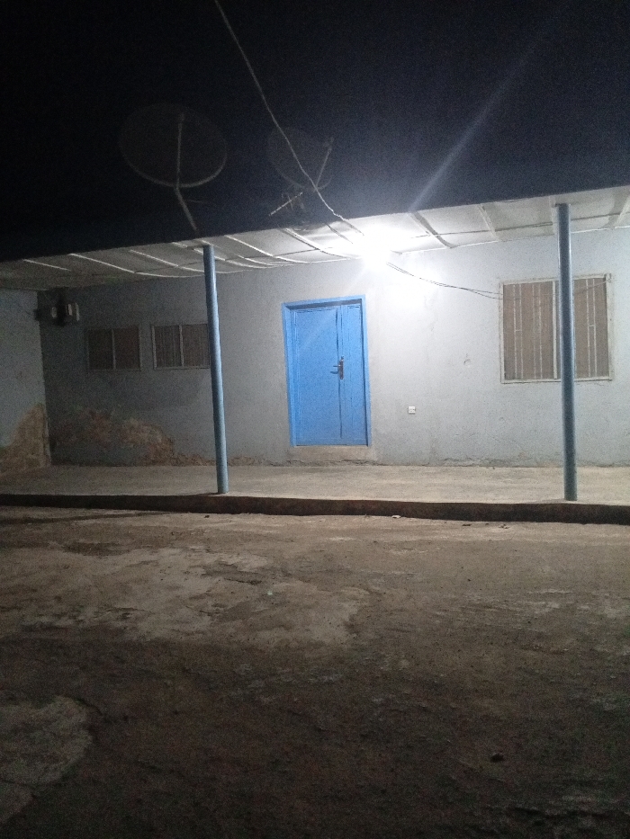 A single-story building with a blue door stands under a covered porch. Metal bars cover the windows. Two cylindrical pillars support the porch roof. A satellite dish is visible above. The ground in front of the building is uneven and dark. An overhead light illuminates the porch.