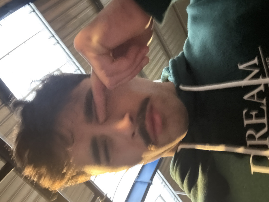 A male individual is depicted in a close-up, upward-angled view, from the chest up. He possesses dark hair, styled with volume, and a prominent mustache. His left eye is observed closed or heavily squinted, with the index finger of his left hand pressing against its inner corner. He is attired in a dark teal hooded sweatshirt featuring a white drawstring and the partial word "DREAM" printed in white on the front. The background comprises an overhead light-colored, possibly slatted or corrugated, ceiling or roof structure, indicative of an interior or semi-sheltered environment. A dark blue structural beam is partially visible on the upper left. The lighting is bright and originates from above, casting highlights on the subject's hair and the left side of his face. The specific location within Chantepie, France, is not discernible from the visual information presented.
