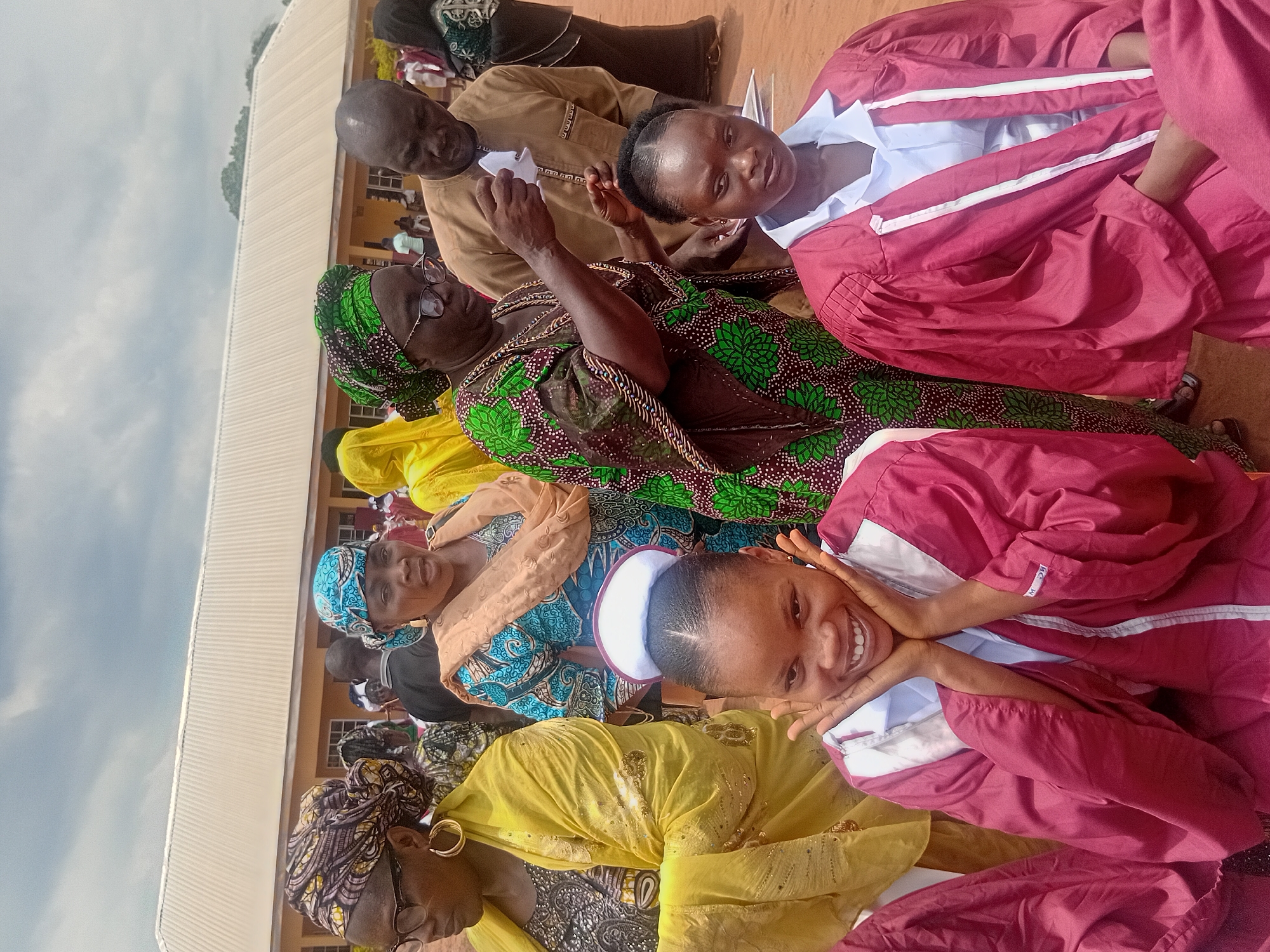 A medium shot captures a group of people in Ejule, Nigeria, positioned close together and facing the camera. One person at the front smiles with hands positioned under their chin. Others are visible behind. The location seems to be an outdoor gathering, with a building visible in the background. The sky is visible at the top of the frame. The scene conveys a sense of community and relaxed atmosphere.