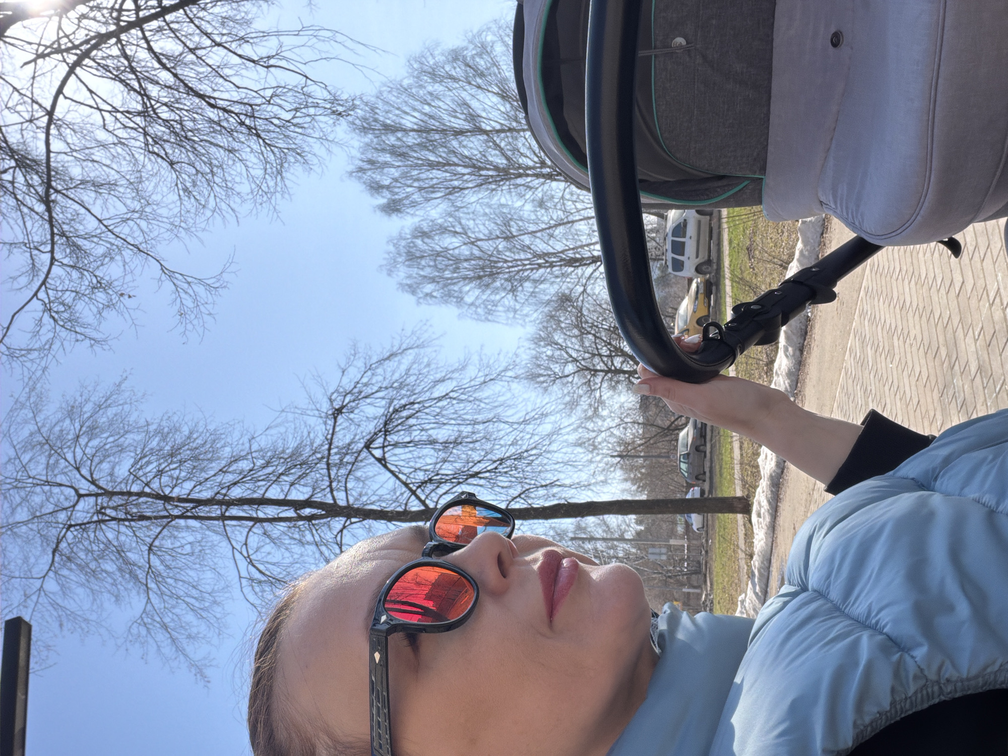 woman wearing sunglasses, a light blue puffer jacket, and a black long-sleeved shirt. She is holding onto the handle of a baby stroller. In the background, there are bare trees, a blue sky, and a paved sidewalk. Several parked cars can also be seen. The photograph was taken in Chaikovsky, Russia.