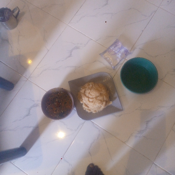 The image displays an indoor scene on a light-colored, white and grey marble-patterned tiled floor in Awo Ekiti, Nigeria. A meal is set out, featuring a brown, rounded bowl on the left containing a dark, reddish-brown stew or soup with visible green and red components. Adjacent to it on the right, a light grey, rectangular plate with rounded corners holds a large, textured mound of a light beige, solid food, consistent with a 'swallow' dish. An empty, dark teal-colored plastic bowl is positioned to the right of the plate. Above this empty bowl, a clear plastic sachet, likely containing water, rests on the floor. In the upper left quadrant, a silver-colored metal mug with a handle is visible. A dark, partially obscured object, possibly a furniture leg, is present on the far left edge. A bare, dark-skinned human foot is partially visible in the bottom right corner of the frame, indicating the presence of an individual. Multiple bright reflections from an unseen light source are visible on the tiled surface.