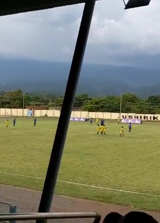 The scene captures a soccer game at the Ushirika Stadium in Moshi, Tanzania