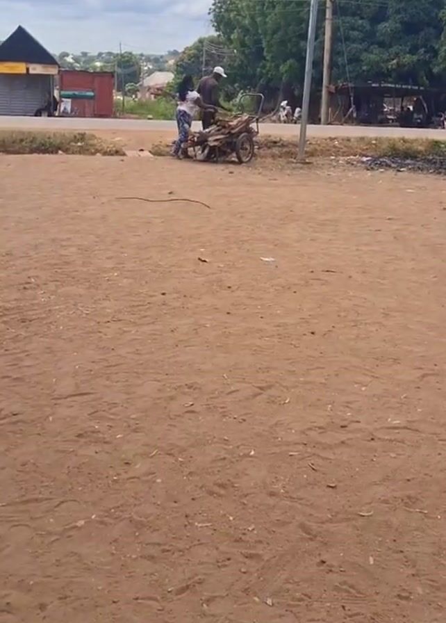 wide shot of a dirt lot adjacent to a road in a rural area. In the distance, two people stand near a small, makeshift vehicle, possibly a motorized tricycle or cart. The first person is wearing a patterned shirt and the second is wearing a white cap and dark shirt. They appear to be interacting with the vehicle, possibly examining or adjusting something on it. The foreground is dominated by the expanse of the dirt lot, which is predominantly brown. In the background, there is a road and various small buildings, including what appear to be shops or stalls. Green trees and vegetation are scattered throughout the scene, and utility poles are visible. The sky is overcast. The camera pans slightly to the right, focusing on the dirt lot and buildings further into the frame. Litter is visible on the dirt.