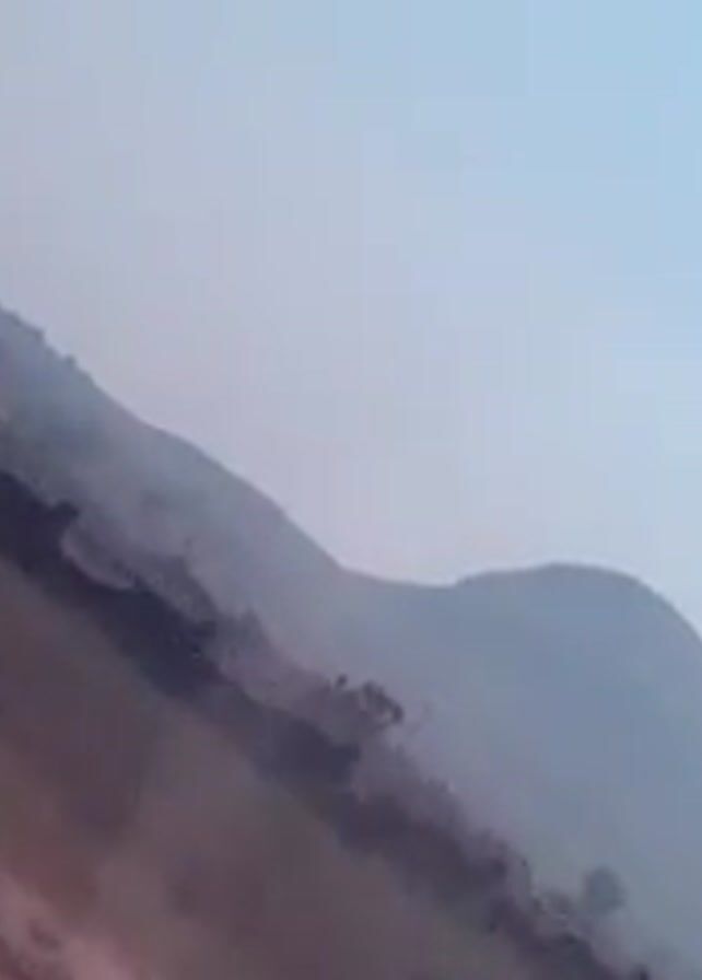 mountainous landscape. The camera is in motion, moving along a road. A white van passes by. There are trees and power lines visible. The sky is overcast.