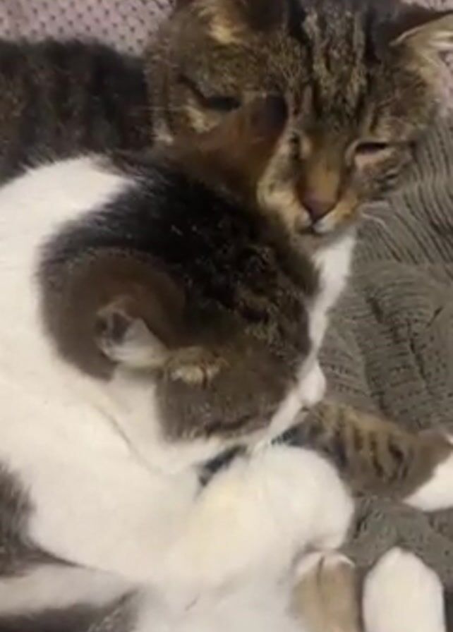 Two cats are snuggling on a couch. One is a tabby cat with brown and black stripes and eyes shut. The other is white with brown and black spots, and opens its eyes when it hears a "Psst" sound. They are lying on a gray textured blanket on a couch.