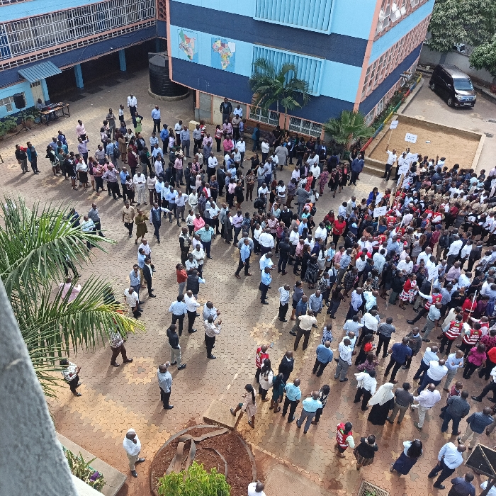 An overhead photograph captures a large gathering in the paved courtyard of the Kenya School of Government (KSG) in Lower Kabete, Nairobi