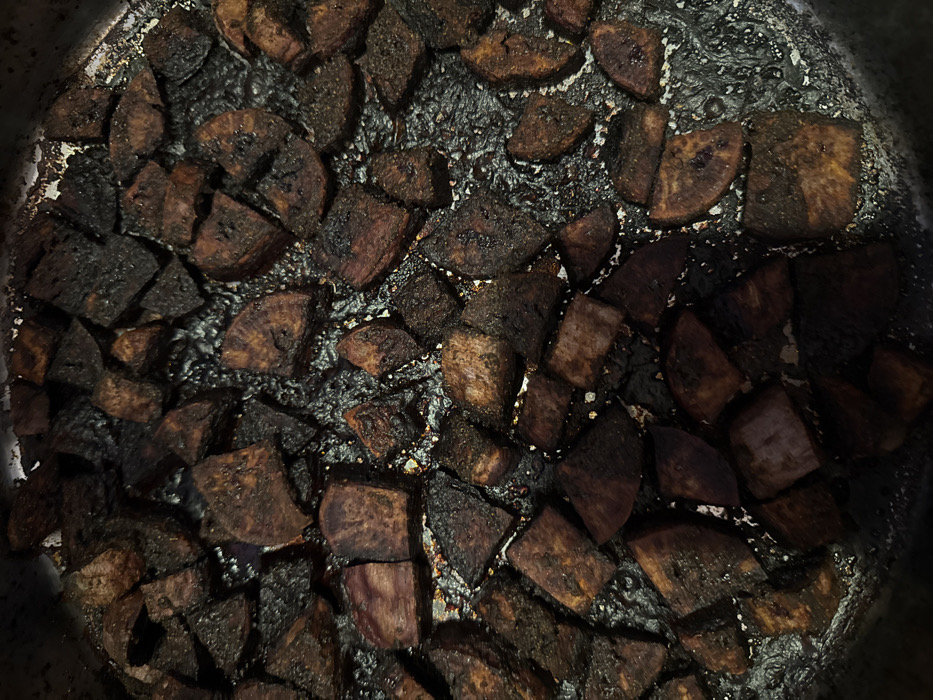 - "The image displays a close-up, overhead view of numerous irregularly shaped pieces of severely charred food, consistent with roasted or fried root vegetables such as potatoes or yams, inside a dark cooking vessel, likely a metal pan" by FM-me2352, licensed under CC BY 4.0