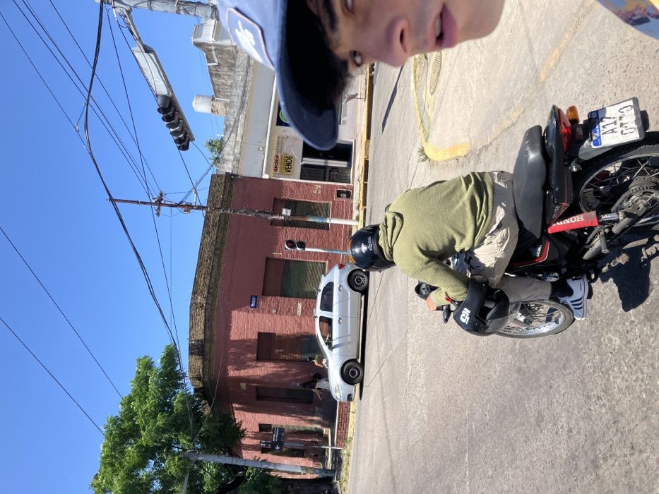 A selfie captures a person in a blue cap, partially cropped, above a street scene. A man on a Honda motorcycle, wearing a helmet and an olive green shirt, prepares to drive. Behind him, a white car is parked next to a red brick building with a "VENTA" sign. A traffic light pole with multiple lights is visible against a clear blue sky. Power lines stretch across the frame.