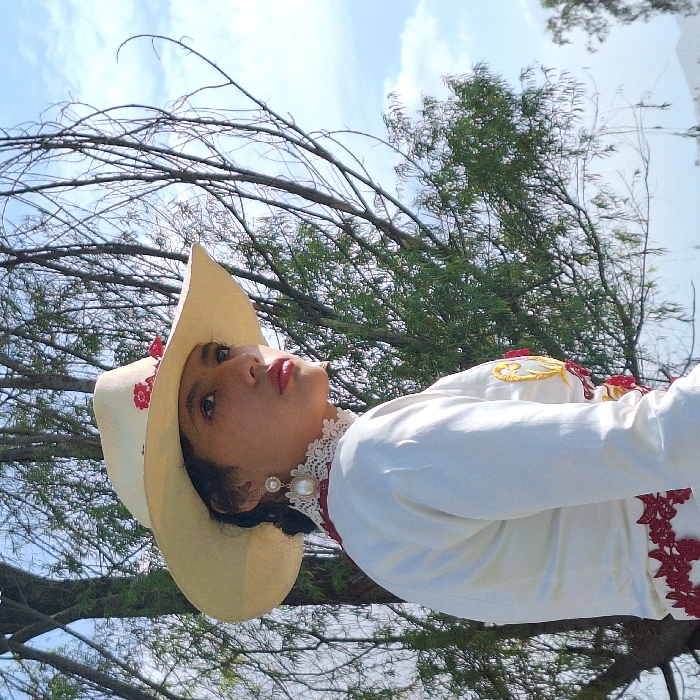 A woman in a cowboy hat and white suit with red accents poses outdoors. She has dark hair pulled back and is wearing pearl earrings and a lace collar. The suit has gold embroidery on the shoulders and red floral accents. Bare tree branches and green foliage fill the background, with a bright blue sky visible above. The camera angle is low, looking up at the woman as she gazes upward with red lips.