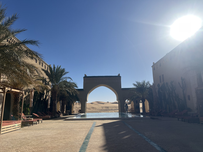 This image depicts an outdoor courtyard scene at a desert resort in Rissani, Morocco, under a clear blue sky with a prominent sun flare in the upper right