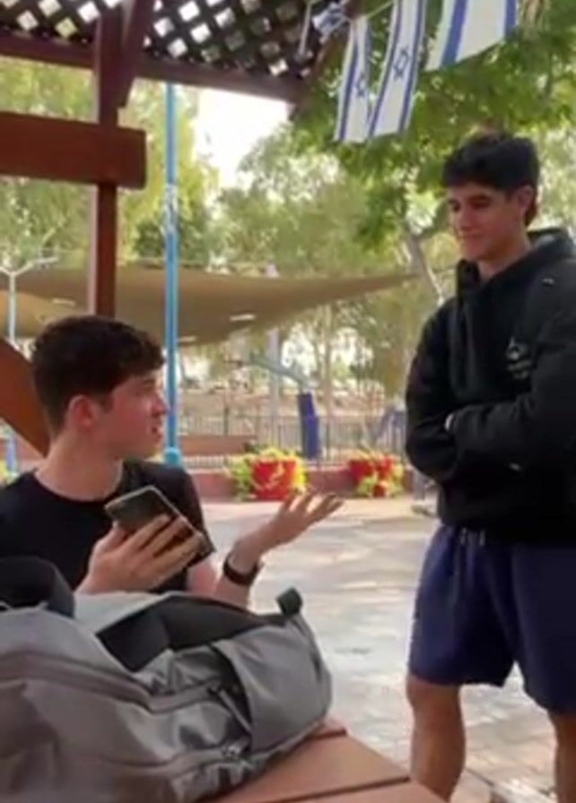 Two young men stand at a wooden table under a pavilion with Israeli flags hanging from the roof. The man on the left wears a black t-shirt, gestures with his hands, and holds a wallet. A gray duffel bag rests on the table in front of him. The man on the right wears a black hoodie and blue shorts, with his arms crossed. The scene is outdoors with other buildings and greenery in the background.