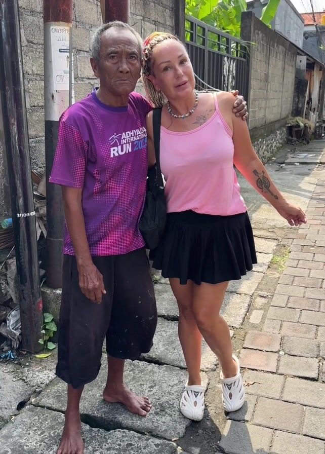still shot of an elderly Asian man and a white woman posing together on a brick-paved street. The man is barefoot, wearing a purple t-shirt and dark brown shorts. He has a weathered face and is standing with his arm around the woman. The woman is wearing a pink tank top, black mini skirt, and white Crocs. She has blond hair with colorful braids and several tattoos visible on her arms and chest. They both are smiling and giving a thumbs-up. The background includes a concrete wall with pipes attached to it, foliage, and a fence. The setting appears to be a narrow street or alley.