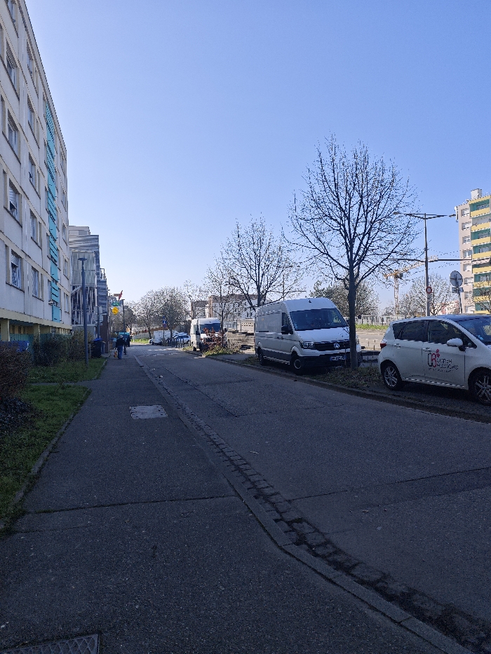 The image depicts an urban street scene in Schiltigheim, France, under a clear blue sky. A light-colored multi-story residential building with blue window features occupies the left side of the frame. A paved sidewalk runs alongside this building, separated by a narrow strip of grass and shrubs. A single individual in dark attire walks away from the camera on the sidewalk, towards the background. An asphalt road, bisected by a strip of dark, textured paving, runs parallel to the sidewalk. Two white commercial vans, including a Volkswagen Crafter, are parked on the right side of the road, facing away from the observer. A white compact car, branded with "KITCHEN URGENCE" on its passenger door, is parked behind the visible van. Bare deciduous trees are distributed along the roadside and in the mid-ground. In the far background, a multi-story building with yellow and green facades and a construction crane are visible. The scene is illuminated by direct sunlight, casting shadows.