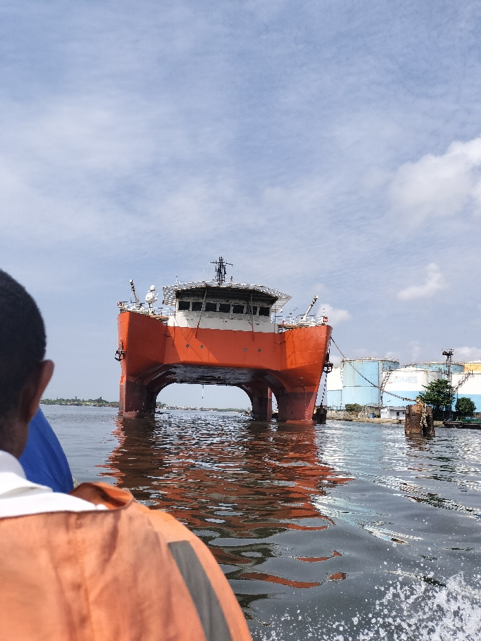An image taken from a moving boat shows a large, orange and white multi-hulled vessel prominently positioned in the center. The vessel features a multi-story superstructure, multiple windows on its bridge, a mast with antenna arrays, and a flat deck possibly serving as a helipad. Its hull design includes visible support legs or pontoons, creating a clear space beneath its main deck above the waterline. The vessel reflects in the dark, choppy water. In the bottom left foreground, the back of a person's head and shoulders is visible, wearing a bright orange life vest over a white collar and a blue garment. White foam and ripples from the moving boat are visible on the water in the foreground. To the right of the vessel, on the distant shore, several large, light blue industrial storage tanks are visible, one of which has the word "TONES" printed in blue lettering. Other industrial structures and sparse vegetation are also present on the shore. To the far left, a low-lying landmass with green vegetation is visible on the horizon. The sky is light blue with scattered white clouds. The scene depicts a marine industrial area within Lagos, Nigeria.
