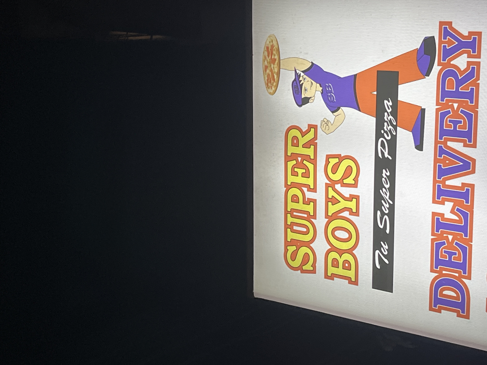 An illuminated sign for "Super Boys Pizza Delivery" is visible