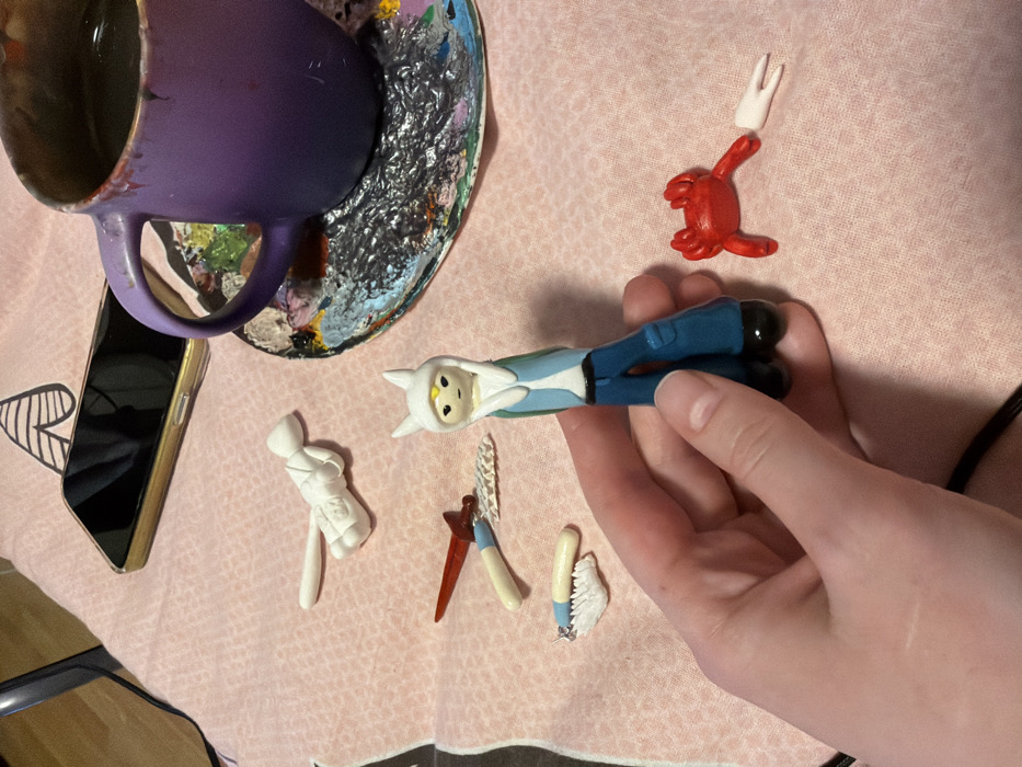 A hand holds a stretched clay figure of Finn from Adventure Time. Nearby are other clay figures, including a red creature with an antenna and a white figure holding a baseball bat. A purple mug sits on an artist's palette next to a smartphone. The scene is set on a patterned pink surface.