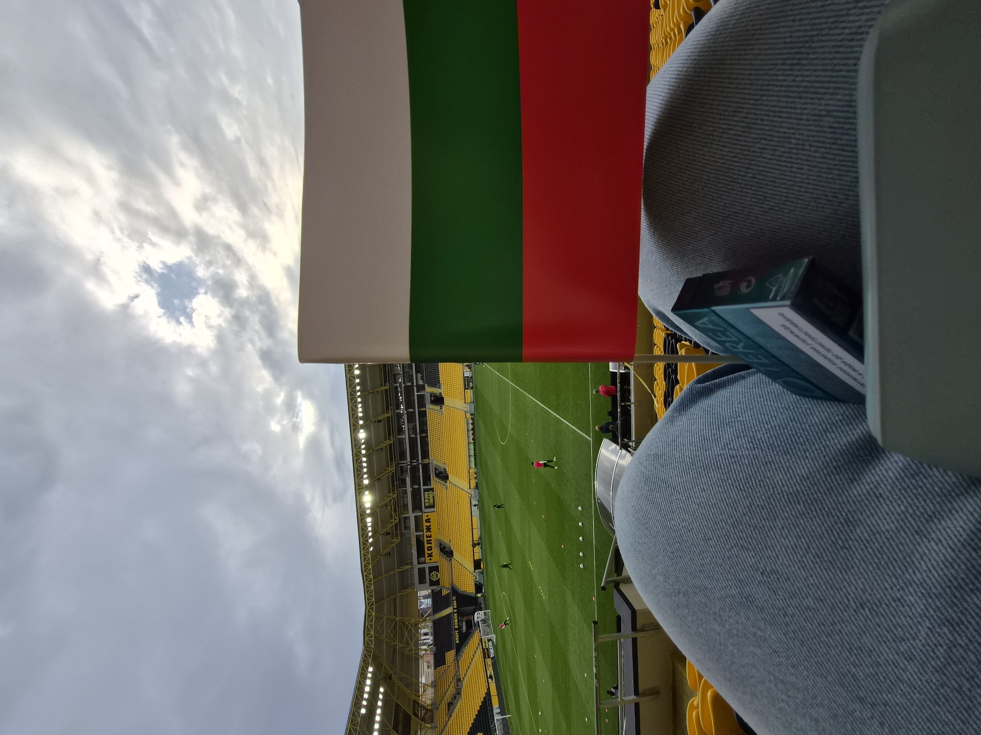 partial view from stadium seating. A Bulgarian flag is visible in the foreground. Beyond the flag, a soccer field and stadium architecture with yellow seating are visible. The stadium has floodlights illuminated around the top. A person is seated wearing blue denim jeans, a light blue pack of cigarettes, and an adjacent light-colored solid surface are positioned near the person's thigh. Above, the sky is filled with gray and white clouds. The stadium is the Lokomotiv Stadium in Plovdiv, Bulgaria, as indicated by the writing in Bulgarian on the stands and overall appearance. People are seen in different parts of the green soccer field.