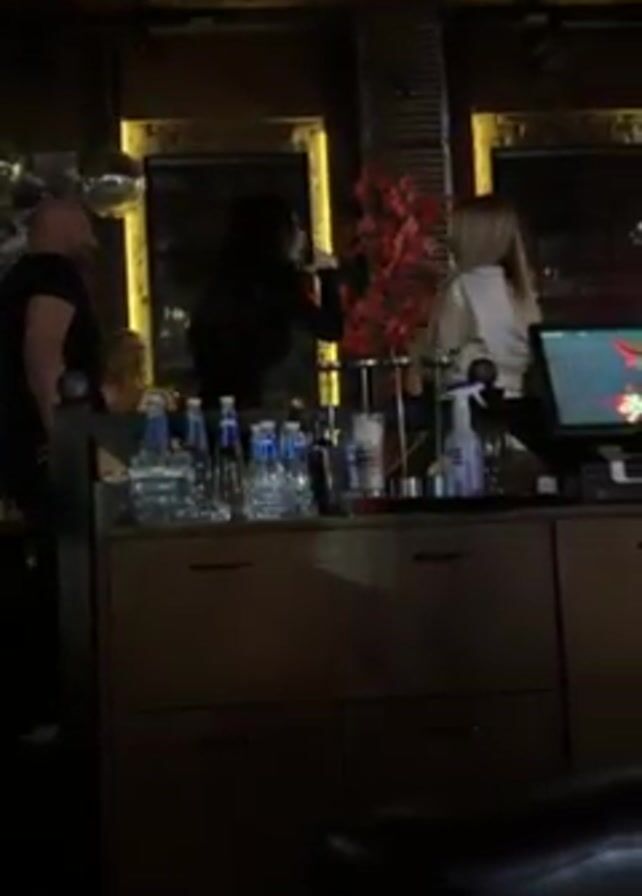 dimly lit scene inside what appears to be a bar or restaurant. There are several people present. In the center, a woman with dark hair is singing into a microphone. To her right stands another woman with blonde hair who appears to be watching her sing. Behind them is a bar counter stocked with various bottles and glassware. A computer monitor is visible on the right side of the counter. To the left of the singing woman is a man wearing a black t-shirt. Other people can be seen in the background, but they are less prominent. The walls are paneled with dark wood and decorative elements such as mirrors and red foliage. The lighting is subdued, creating a cozy ambiance.