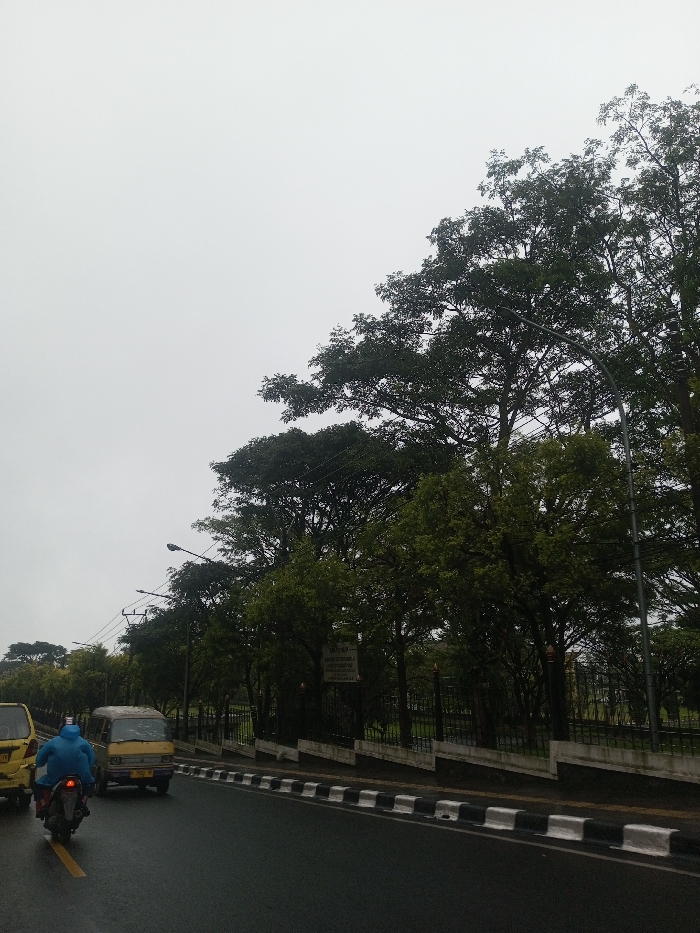 This image captures a street scene in Babaliya Mal., India, under a uniformly overcast, light grey sky. The asphalt road surface is visibly wet. In the immediate foreground, a person clad in a blue rain jacket or similar outerwear is operating a dark-colored motorcycle, moving away from the viewer. To the left of the motorcycle, a portion of a yellow vehicle is visible. Further ahead in the same lane, a light yellow or beige van with a dark roof and a visible front grille is present; its license plate begins with an indiscernible letter, possibly "H" or "B", followed by numbers. The right side of the road is delineated by a curb featuring alternating black and white stripes. Beyond the curb, a low concrete wall topped with a black metal fence runs parallel to the road. Behind this fence, a dense canopy of tall, leafy green trees dominates the right half of the frame, extending into the background. Several streetlights with curved arms and overhead power lines are visible among the trees. A light-colored sign with dark, illegible text is positioned within the tree line on the right side.