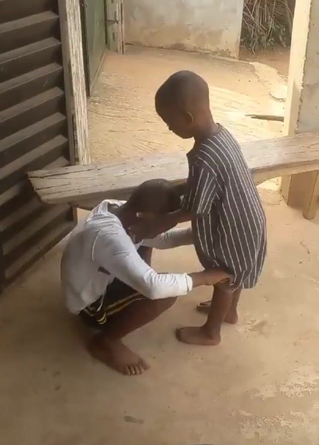 A barefoot child in a striped outfit stands still while another barefoot child in a white shirt and dark shorts crouches down and examines the first child's foot. The crouching child appears to be holding the standing child's foot. They are both outside in what appears to be a yard, with a wooden bench behind them, a door with slats to the left, and a large, dark-colored basin in the lower foreground.