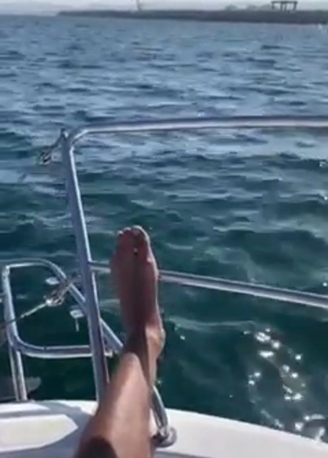 The video opens with a first-person perspective from the bow of a boat. A pair of bare legs and feet are visible, resting on the white deck near a metal railing. The camera pans up to reveal a wide expanse of water with sparkling sunlight. In the distance, a landmass with hills and a crane on a structure is visible against a partly cloudy sky. The sun shines brightly.
