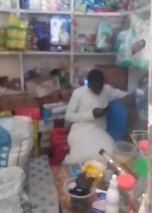 cluttered shop interior. The camera focuses on a person sitting behind a table filled with various items, possibly packaging or crafting materials. The person is wearing a white garment and is seen holding a blue container. Behind the person, shelves are packed with a variety of products. The camera then shifts to the person holding the phone. The person is wearing a pink top with blue straps. The background is filled with packaged items, suggesting the video is being taken in a commercial or small retail space.