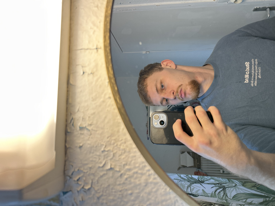 A young adult male, appearing to be in his twenties, is captured in a mirror selfie taken indoors in Strasbourg, France