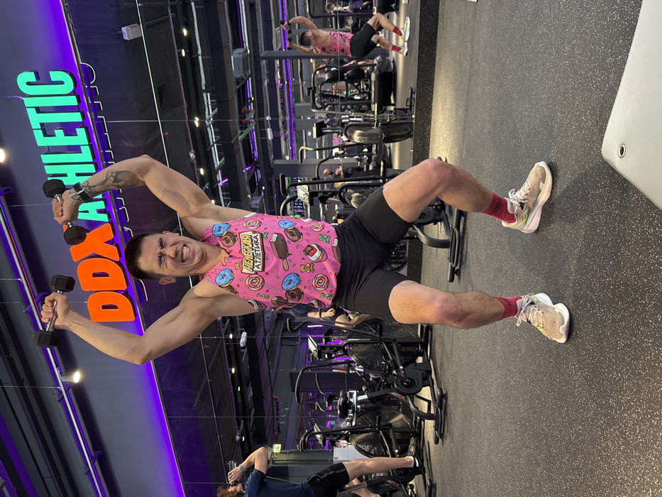 An athletic adult male is performing an overhead dumbbell exercise in a DDX ATHLETIC gym in Kazan, Russia. He stands centrally, captured mid-squat with both arms extended overhead, holding a hexagonal dumbbell in each hand. His face exhibits a strained expression, with squinted eyes and an open mouth revealing teeth. He wears a pink sleeveless tank top adorned with cartoon illustrations of donuts, ice cream, lollipops, and gummy bears, featuring the Russian text "НЕЛЕГКАЯ АТЛЕТИКА" (Hard Athletics). Black athletic shorts, red socks, and beige and white athletic shoes complete his attire; a tattoo is visible on his left forearm. The background consists of a mirrored wall reflecting multiple black air bikes and other gym equipment. A prominent neon sign, displaying "DDX ATHLETIC" in orange and green letters against a purple illuminated panel, is visible above the mirrored section. A second male individual, wearing a dark blue shirt and black shorts, is partially visible to the left, near an air bike. The floor is a dark grey speckled rubber gym surface. The primary subject's reflection is visible in the mirrored wall to the right.