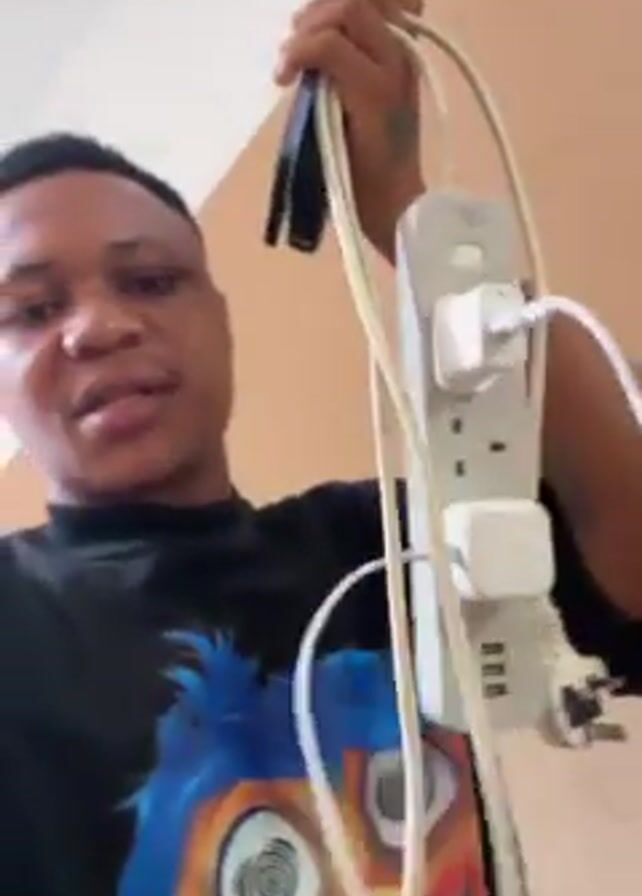 man holding a cell phone and a white surge protector with multiple chargers plugged in