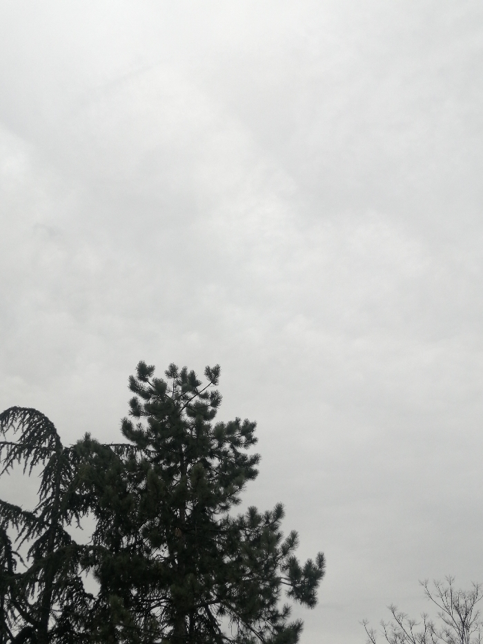 The scene, located in Galabovo, Bulgaria, presents an outdoor environment under an overcast sky. The upper two-thirds of the image consist of a uniform, light gray cloud cover. The lower third features the upper sections of multiple trees. A prominent evergreen tree with dense, dark green needle foliage is centered towards the bottom. To its left, a portion of another conifer with finer branches is visible. In the lower right, the bare branches of a deciduous tree are present. No individuals, structures, or objects of human origin are discernible within the frame. The ambient light is diffuse.