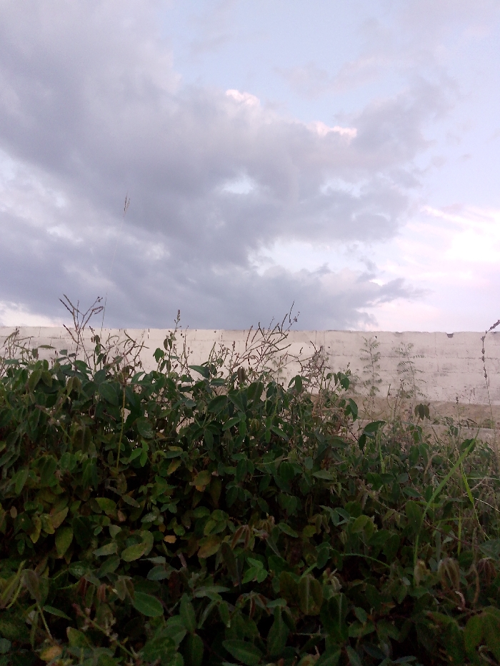 A cloudy sky above a tall, white, concrete wall. The foreground is filled with lush, green vegetation, including leafy plants and taller, spiky grasses. The sky shows various shades of gray, indicating a cloudy day. The wall appears textured and possibly worn, contrasting with the vibrant green plants. The overall scene suggests a natural setting with a constructed boundary.