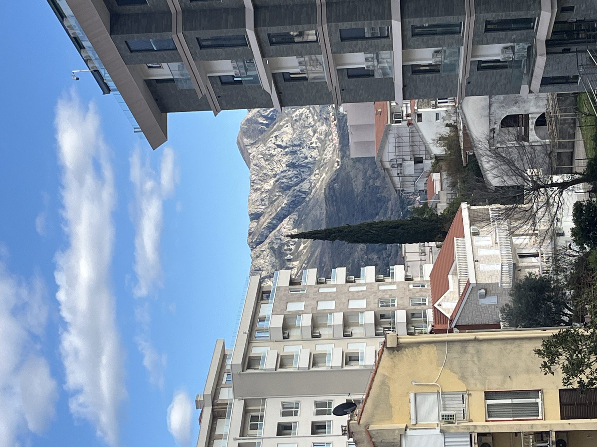 This image shows a view in Boreti, Montenegro, dominated by a large, rocky mountain in the background. Several buildings frame the view, including modern apartment buildings with balconies and older buildings with red tile roofs. The sky is blue with scattered white clouds. The tree is a tall, thin conifer. A satellite dish is visible on one of the buildings. There are no people visible in the frame.
