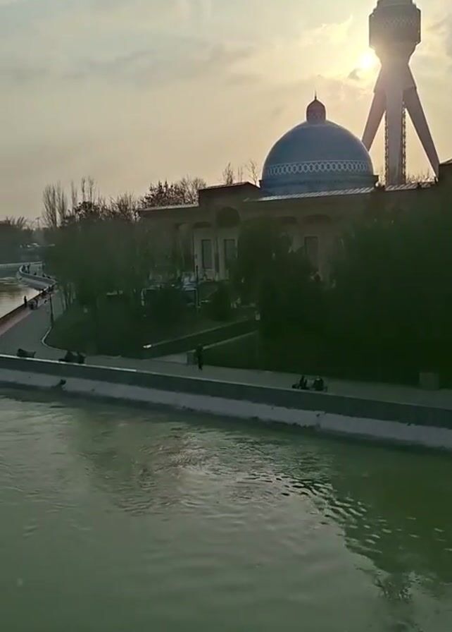 river with a building with a blue dome on the right bank. The sun is setting behind the building and the Tashkent Tower which is slightly to the right of the building. There are people walking along the riverbank. The river is a murky green color. The trees are bare. The sky is a mix of blue and yellow due to the setting sun. The camera is panning to the left, showing more of the river.