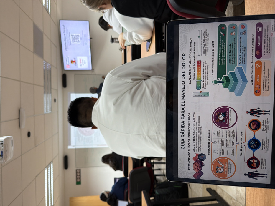 The image features a guide on pain management, presented on a digital screen. It covers pain definition, acute vs. chronic pain, and pain origins (nociceptive, neuropathic, nociplastic). The guide includes pain assessment methods like the Numerical Rating Scale (NRS) and Visual Analog Scale (VAS). The WHO analgesic ladder is depicted, showing a tiered approach to pain relief with non-opioids, weak opioids, and strong opioids. Key considerations for using NSAIDs versus opioids are noted.