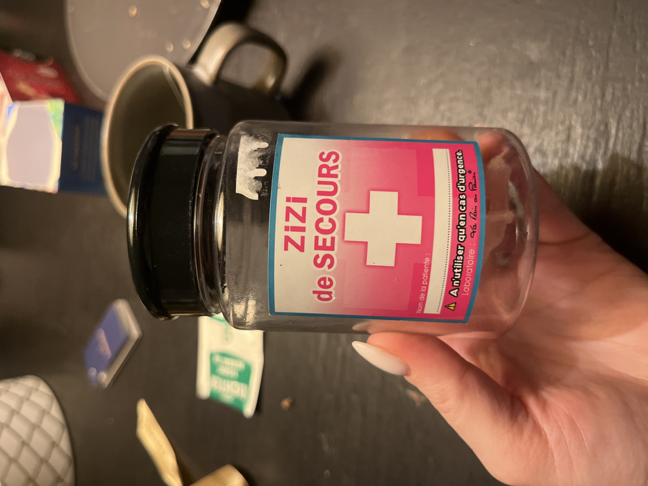 small, clear plastic jar with a black lid. A label on the jar is predominantly pink and features a white cross symbol, similar to a medical aid symbol. Above the cross, the words "ZiZi de SECOURS" are printed in a bold font. Below the cross, smaller text reads "Nom de la patiente:" and "A n'utiliser qu'en cas d'urgence," followed by "Laboratoire : Va Pain au Paris." The jar is being held in a hand with manicured nails.