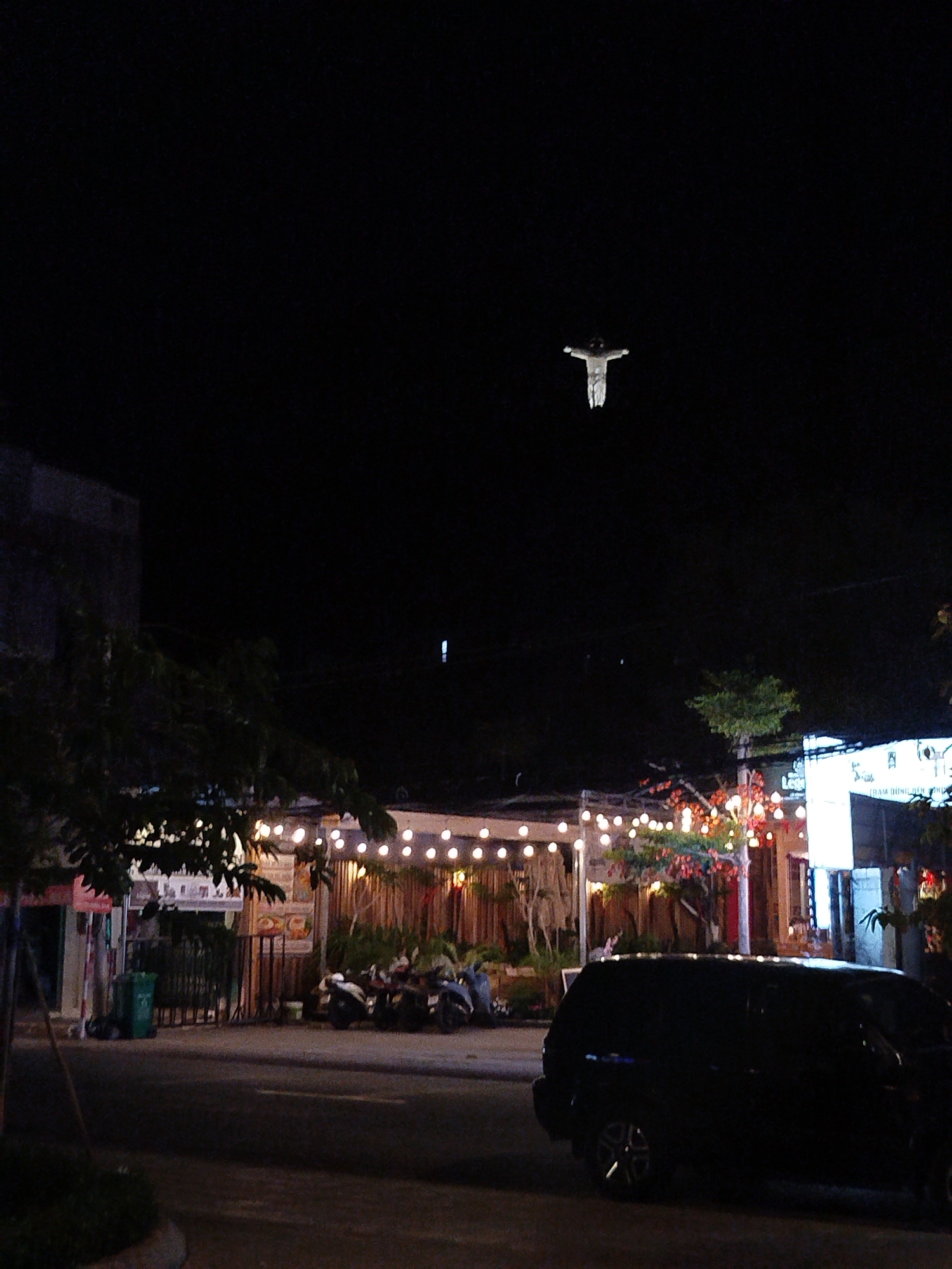At night in Ho Chi Minh City, Vietnam, the image shows a street scene with businesses and parked motorcycles. String lights illuminate the storefronts, and a black SUV is parked on the street. In the sky, there is a figure that is floating and looks to be dressed in white.