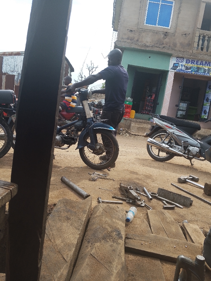 This image depicts an outdoor motorcycle repair or service area in Lokoja, Nigeria