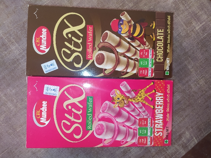 - "The image displays two rectangular cardboard boxes of "CBL Munchee StiX Rolled Wafer" product, positioned upright side-by-side on a textured grey surface" by FM-vInnf2, licensed under CC BY 4.0