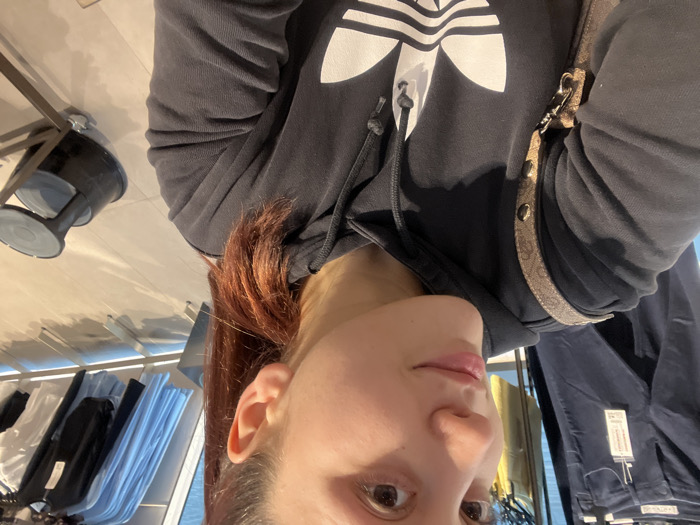 A selfie taken indoors, showing a woman wearing a black Adidas hoodie with a white logo