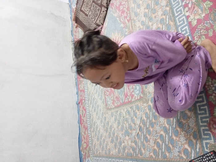 An individual, identified as a young female of apparent Southeast Asian ethnicity, is depicted seated on a patterned rug within an interior space in Bulukandang, Indonesia
