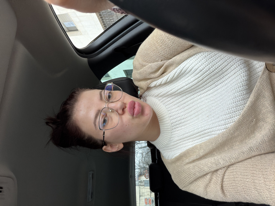 A female individual is depicted seated within a vehicle, likely occupying a front seat, captured in a selfie perspective