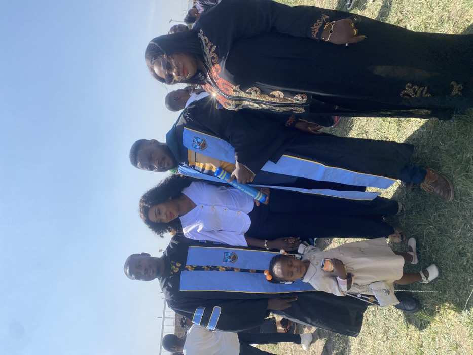 The image depicts five individuals positioned in the foreground of an outdoor gathering under a clear, bright sky. The ground consists of dry grass and dirt. In the background, numerous blurry figures suggest a crowd. From left to right: 1. An adult male with dark skin and short dark hair wears a black academic gown with light blue and gold trim and a crest on the left chest. He stands upright, looking slightly to his left. 2. An adult female with dark skin and long dark curly hair wears a white long-sleeved button-up blouse and black trousers. She smiles faintly, looking forward. Her right hand is clasped with the child's left hand. 3. A young female child, estimated 2-4 years old, with dark skin and two pigtails adorned with orange ties, wears a light tan/beige long-sleeved dress-coat, white ankle-strap shoes, and carries a small white chain-strap purse. She holds a small orange-colored can or bottle in her right hand and looks downwards. 4. An adult male with dark skin, a short dark beard, and short dark hair wears a black academic gown identical to the first male's. He holds a blue cylindrical diploma case in his left hand and looks straight ahead. 5. An adult female with dark skin, long dark hair, and large rectangular sunglasses wears a long black dress featuring elaborate gold, yellow, and red embroidery on the chest and sleeves. She displays gold-colored rings and a bracelet on her right hand and smiles while looking slightly to her right. The scene suggests a graduation ceremony or a celebratory event, likely taking place in the city of Rafin Par, Nigeria.