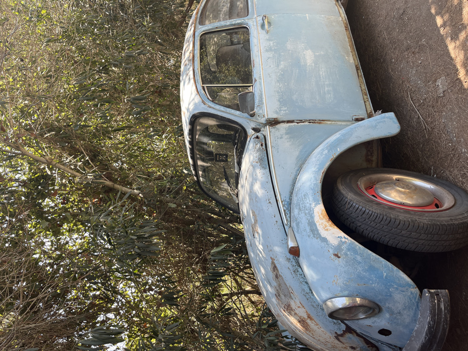 A light blue, heavily weathered and rusted Volkswagen Beetle (Type 1) is prominently displayed, parked on a dirt ground surface under dense, leafy green and brown foliage. The vehicle's paint is significantly faded and peeling, with extensive reddish-brown rust visible on all panels, particularly the hood, roof, and passenger door. The front left quarter of the car, including the headlight, turn signal, and black bumper, is clearly visible. The front left wheel features a silver hubcap with a red ring. A black air freshener hangs from the rearview mirror inside the vehicle. The ground beneath the car is dry, light brown earth, suggesting an outdoor, possibly unpaved, location. Sunlight filters through the overhead canopy, creating dappled shadows on the car and ground. No individuals, actions, or interactions are present in the scene, which is located in the Menashe Regional Council, Israel.